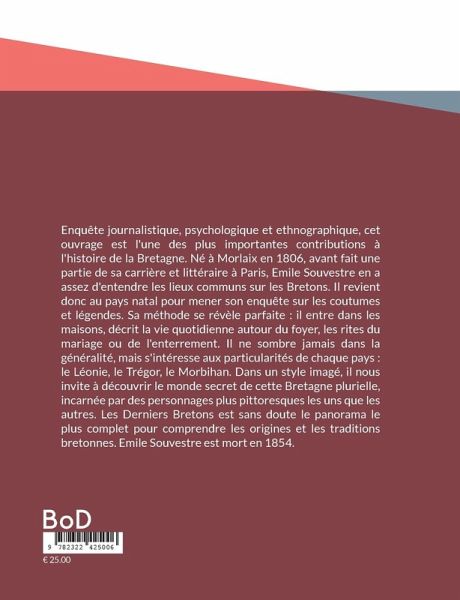 Enquête journalistique, psychologique et ethnographique, cet ouvrage est l'une des plus importantes contributions à l'histoire de la Bretagne. Né à Morlaix en 1806, avant fait une partie de sa carrière et littéraire à Paris, Emile Souvestre en a assez d'entendre les lieux communs sur les Bretons. Il revient donc au pays natal pour mener son enquête sur les coutumes et légendes. Sa méthode se révèle parfaite : il entre dans les maisons, décrit la vie quotidienne autour du foyer, les rites du mariage ou de l'enterrement. Il ne sombre jamais dans la généralité, mais s'intéresse aux particularités de chaque pays : le Léonie, le Trégor, le Morbihan. Dans un style imagé, il nous invite à découvrir le monde secret de cette Bretagne plurielle, incarnée par des personnages plus pittoresques les uns que les autres. Les Derniers Bretons est sans doute le panorama le plus complet pour comprendre les origines et les traditions bretonnes. Emile Souvestre est mort en 1854.