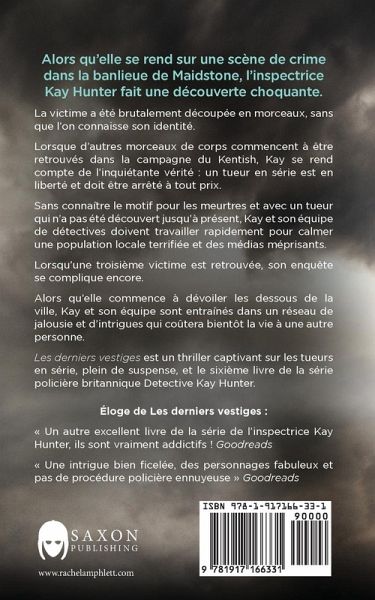 Alors qu'elle se rend sur une scène de crime dans la banlieue de Maidstone, l'inspectrice Kay Hunter fait une découverte choquante. La victime a été brutalement découpée en morceaux, sans que l'on connaisse son identité. Lorsque d'autres morceaux de corps commencent à être retrouvés dans la campagne du Kentish, Kay se rend compte de l'inquiétante vérité un tueur en série est en liberté et doit être arrêté à tout prix. Sans connaître le motif pour les meurtres et avec un tueur qui n'a pas été découvert jusqu'à présent, Kay et son équipe de détectives doivent travailler rapidement pour calmer une population locale terrifiée et des médias méprisants. Lorsqu'une troisième victime est retrouvée, son enquête se complique encore. Alors qu'elle commence à dévoiler les dessous de la ville, Kay et son équipe sont entraînés dans un réseau de jalousie et d'intrigues qui coûtera bientôt la vie à une autre personne. Les derniers vestiges est un thriller captivant sur les tueurs en série, plein de suspense, et le sixième livre de la série policière britannique Detective Kay Hunter. Éloge de Les derniers vestiges: Un autre excellent livre de la série de l'inspectrice Kay Hunter, ils sont vraiment addictifs ! Goodreads Une intrigue bien ficelée, des personnages fabuleux et pas de procédure policière ennuyeuse Goodreads Les enquêtes de Détective Kay Hunter: 1. Mort de peur 2. La volonté de vivre 3. Innocence mortelle 4. L'enfer à payer 5. Un secret bien gardé 6. Les derniers vestiges 7. Les os en silence 8. Du berceau à la tombe 9. Pas d'évasion 10. Une mort solitaire 11. Un secret mortel 12. Une vengeance amère 13. Une promesse mortelle 14. Un silence fatal
