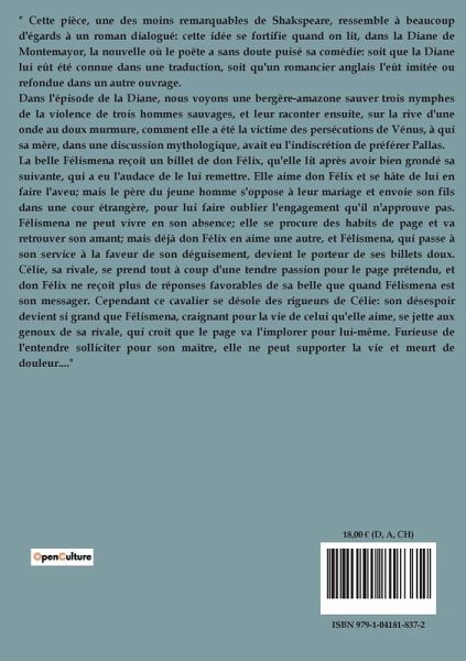 " Cette pièce, une des moins remarquables de Shakspeare, ressemble à beaucoup d'égards à un roman dialogué: cette idée se fortifie quand on lit, dans la Diane de Montemayor, la nouvelle où le poëte a sans doute puisé sa comédie: soit que la Diane lui eût été connue dans une traduction, soit qu'un romancier anglais l'eût imitée ou refondue dans un autre ouvrage. Dans l'épisode de la Diane, nous voyons une bergère-amazone sauver trois nymphes de la violence de trois hommes sauvages, et leur raconter ensuite, sur la rive d'une onde au doux murmure, comment elle a été la victime des persécutions de Vénus, à qui sa mère, dans une discussion mythologique, avait eu l'indiscrétion de préférer Pallas. La belle Félismena reçoit un billet de don Félix, qu'elle lit après avoir bien grondé sa suivante, qui a eu l'audace de le lui remettre. Elle aime don Félix et se hâte de lui en faire l'aveu; mais le père du jeune homme s'oppose à leur mariage et envoie son fils dans une cour étrangère, pour lui faire oublier l'engagement qu'il n'approuve pas. Félismena ne peut vivre en son absence; elle se procure des habits de page et va retrouver son amant; mais déjà don Félix en aime une autre, et Félismena, qui passe à son service à la faveur de son déguisement, devient le porteur de ses billets doux. Célie, sa rivale, se prend tout à coup d'une tendre passion pour le page prétendu, et don Félix ne reçoit plus de réponses favorables de sa belle que quand Félismena est son messager. Cependant ce cavalier se désole des rigueurs de Célie: son désespoir devient si grand que Félismena, craignant pour la vie de celui qu'elle aime, se jette aux genoux de sa rivale, qui croit que le page va l'implorer pour lui-même. Furieuse de l'entendre solliciter pour son maître, elle ne peut supporter la vie et meurt de douleur...."