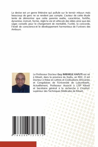 La devise est un genre littéraire qui pullule sur le terroir mbuun mais beaucoup de gens ne se rendent pas compte. L'auteur de cette étude tente de démontrer que cette paremie exalte, caractérise, fortifie, dynamise, instruit, forme, règle la vie et véhicule des idées ainsi que des sages conseils pour le changement de mentalité, l'unité, la concorde, l'éveil de conscience et le développement harmonieux de l'univers des Ambuun.