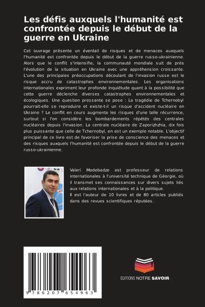 Cet ouvrage présente un éventail de risques et de menaces auxquels l'humanité est confrontée depuis le début de la guerre russo-ukrainienne. Alors que le conflit s'intensifie, la communauté mondiale suit de près l'évolution de la situation en Ukraine avec une appréhension croissante. L'une des principales préoccupations découlant de l'invasion russe est le risque accru de catastrophes environnementales. Les organisations internationales expriment leur profonde inquiétude quant à la possibilité que cette guerre déclenche diverses catastrophes environnementales et écologiques. Une question pressante se pose : La tragédie de Tchernobyl pourrait-elle se reproduire et existe-t-il un risque d'accident nucléaire en Ukraine ? Le conflit en cours augmente les risques d'une telle récurrence, surtout si l'on considère les bombardements répétés des centrales nucléaires depuis l'invasion. La centrale nucléaire de Zaporizhzhia, dix fois plus puissante que celle de Tchernobyl, en est un exemple notable. L'objectif principal de ce livre est de favoriser la prise de conscience des menaces et des risques auxquels l'humanité est confrontée depuis le début de la guerre russo-ukrainienne.
