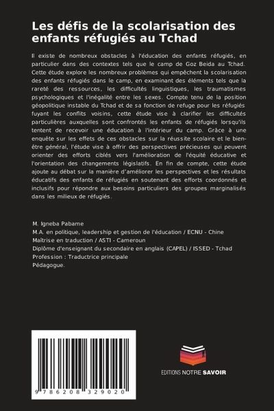Il existe de nombreux obstacles à l'éducation des enfants réfugiés, en particulier dans des contextes tels que le camp de Goz Beida au Tchad. Cette étude explore les nombreux problèmes qui empêchent la scolarisation des enfants réfugiés dans le camp, en examinant des éléments tels que la rareté des ressources, les difficultés linguistiques, les traumatismes psychologiques et l'inégalité entre les sexes. Compte tenu de la position géopolitique instable du Tchad et de sa fonction de refuge pour les réfugiés fuyant les conflits voisins, cette étude vise à clarifier les difficultés particulières auxquelles sont confrontés les enfants de réfugiés lorsqu'ils tentent de recevoir une éducation à l'intérieur du camp. Grâce à une enquête sur les effets de ces obstacles sur la réussite scolaire et le bien-être général, l'étude vise à offrir des perspectives précieuses qui peuvent orienter des efforts ciblés vers l'amélioration de l'équité éducative et l'orientation des changements législatifs. En fin de compte, cette étude ajoute au débat sur la manière d'améliorer les perspectives et les résultats éducatifs des enfants de réfugiés en soutenant des efforts coordonnés et inclusifs pour répondre aux besoins particuliers des groupes marginalisés dans les milieux de réfugiés.
