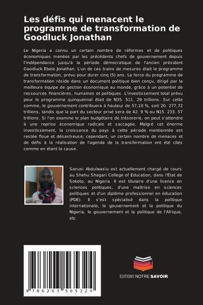 Le Nigeria a connu un certain nombre de réformes et de politiques économiques menées par les précédents chefs de gouvernement depuis l'indépendance jusqu'à la période démocratique de l'ancien président Goodluck Ebele Jonathan. L'un de ces trains de mesures était le programme de transformation, prévu pour durer cinq (5) ans. La force du programme de transformation réside dans un document politique bien conçu, dirigé par la meilleure équipe de gestion économique au monde, grâce à un potentiel de ressources financières, humaines et politiques. L'investissement total prévu pour le programme quinquennal était de N35. 511. 29 trillions. Sur cette somme, le gouvernement contribuera à hauteur de 57,10 %, soit 20. 277,72 trillions, tandis que la part du secteur privé sera de 42. 9 % ou N15. 233. 57 trillions. Si l'on examine le plan budgétaire de trésorerie, on peut s'attendre à une reprise économique radicale et saccagée. Malgré cet énorme investissement, la croissance du pays à cette période mentionnée est restée floue et désastreuse; cependant, un certain nombre de menaces et de défis à la réalisation de l'agenda de la transformation ont été cités comme en étant la cause.