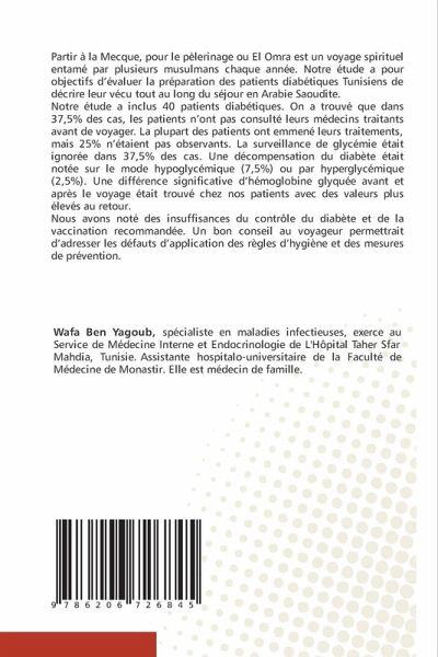 Partir à la Mecque, pour le pèlerinage ou El Omra est un voyage spirituel entamé par plusieurs musulmans chaque année. Notre étude a pour objectifs d'évaluer la préparation des patients diabétiques Tunisiens de décrire leur vécu tout au long du séjour en Arabie Saoudite.Notre étude a inclus 40 patients diabétiques. On a trouvé que dans 37,5% des cas, les patients n'ont pas consulté leurs médecins traitants avant de voyager. La plupart des patients ont emmené leurs traitements, mais 25% n'étaient pas observants. La surveillance de glycémie était ignorée dans 37,5% des cas. Une décompensation du diabète était notée sur le mode hypoglycémique (7,5%) ou par hyperglycémique (2,5%). Une différence significative d'hémoglobine glyquée avant et après le voyage était trouvé chez nos patients avec des valeurs plus élevés au retour.Nous avons noté des insuffisances du contrôle du diabète et de la vaccination recommandée. Un bon conseil au voyageur permettrait d'adresser les défauts d'application des règles d'hygiène et des mesures de prévention.