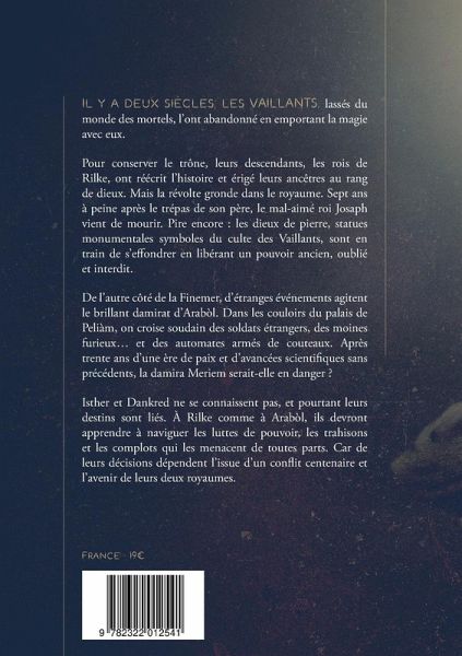 Il y a deux siècles, les légendaires Vaillants, lassés du monde mortel, l'ont abandonné en emportant la magie avec eux. Pour conserver le trône, les rois de Rilke, leurs descendants, ont réécrit l'histoire et érigé leurs ancêtres au rang de dieux. Mais la révolte gronde dans le royaume. Sept ans après le trépas de son père, le mal-aimé roi Josaph vient de mourir. Pire encore : les dieux de pierre, statues monumentales symboles du culte des Vaillants, sont en train de s'effondrer en libérant un pouvoir ancien, oublié et interdit. De l'autre côté de la Finemer, d'étranges événements agitent le brillant damirat d'Arabòl. Dans les couloirs du palais de Peliàm, on croise soudain des soldats étrangers, des moines furieux... et des automates armés de couteaux. Après trente ans d'une ère de paix et d'avancées scientifiques sans précédents, la damira Meriem serait-elle en danger ? Isther et Dankred ne se connaissent pas, et pourtant leurs destins sont liés. À Rilke comme à Arabòl, ils devront apprendre à naviguer les luttes de pouvoir, les trahisons et les complots qui les menacent de toutes parts. Car de leurs décisions dépendent l'issue d'un conflit centenaire et l'avenir de leurs deux royaumes.