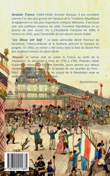 "Les Dieux ont soif" : Ce texte admirable décrit l'horreur du fanatisme, l'obscurantisme et la barbarie prenant le masque du progrès.Ce livre qui dénonçait les excès de la Révolution en 1912, fut accueilli comme un paradoxe.En 1950, ce roman a été inclus dans la liste du Grand Prix des meilleurs romans du demi-siècle.Résumé:Ce roman met en scène la France au sortir de la Révolution. Se déroulant à Paris de 1793 à 1795, l'histoire relate l'ascension infernale d'Evariste Gamelin, jeune peintre aux idéaux révolutionnaires, engagé dans la section de son quartier du Pont -Neuf. Il défend avec ferveur les acquis de la Révolution mais se déshumanise au nom de ce combat...Bonne lecture.