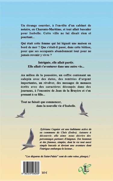 Un étrange courrier, à l'en-tête d'un cabinet de notaire, en Charente-Maritime, et tout allait basculer pour Isabelle. Cette ville ne lui disait rien et pourtant...Qui était cette femme qui lui léguait une maison en bord de mer ? Que s'était-il passé, dans cette bâtisse, pour que ses occupants abandonnent tout pour ne jamais revenir y vivre ? Intriguée, elle allait partir. Elle allait s'aventurer dans une autre vie...Au milieu de la poussière, un coffre contenant un calepin avec des dates, des rentrées d'argent importantes, un révolver, des messages de menaces écrits avec des caractères découpés dans des journaux, à l'encontre de Jean de la Bruyère et s'en prenant à sa fille...Tout ne faisait que commencer, dans la nouvelle vie d'Isabelle.