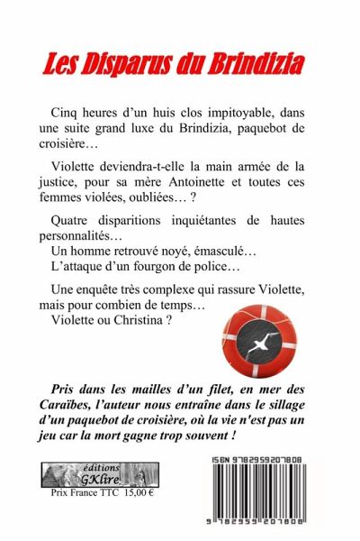 Les Disparus du Brindizia... Cinq heures d'un huis clos impitoyable, dans une suite grand luxe du Brindizia, paquebot de croisière... Violette deviendra-t-elle la main armée de la justice, pour sa mère Antoinette et toutes ces femmes violées, oubliées... ? Quatre disparitions inquiétantes de hautes personnalités... Un homme retrouvé noyé, émasculé... L'attaque d'un fourgon de police... Une enquête très complexe qui rassure Violette, mais pour combien de temps... Violette ou Christina ? Pris dans les mailles d'un filet, en mer des Caraïbes, l'auteur nous entraîne dans le sillage d'un paquebot de croisière, où la vie n'est pas un jeu car la mort gagne trop souvent !