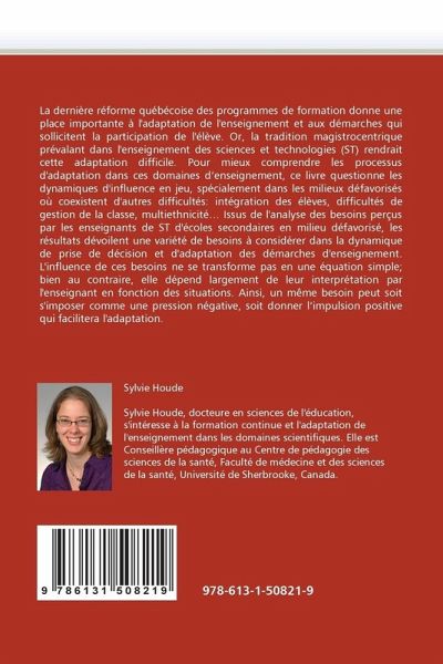 La dernière réforme québécoise des programmes de formation donne une place importante à l'adaptation de l'enseignement et aux démarches qui sollicitent la participation de l'élève. Or, la tradition magistrocentrique prévalant dans l'enseignement des sciences et technologies (ST) rendrait cette adaptation difficile. Pour mieux comprendre les processus d'adaptation dans ces domaines d enseignement, ce livre questionne les dynamiques d'influence en jeu, spécialement dans les milieux défavorisés où coexistent d'autres difficultés: intégration des élèves, difficultés de gestion de la classe, multiethnicité Issus de l'analyse des besoins perçus par les enseignants de ST d'écoles secondaires en milieu défavorisé, les résultats dévoilent une variété de besoins à considérer dans la dynamique de prise de décision et d'adaptation des démarches d'enseignement. L'influence de ces besoins ne se transforme pas en une équation simple; bien au contraire, elle dépend largement de leur interprétation par l'enseignant en fonction des situations. Ainsi, un même besoin peut soit s'imposer comme une pression négative, soit donner l impulsion positive qui facilitera l'adaptation.