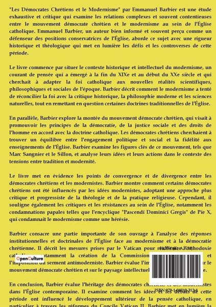 "Les Démocrates Chrétiens et le Modernisme" par Emmanuel Barbier est une étude exhaustive et critique qui examine les relations complexes et souvent contentieuses entre le mouvement démocrate chrétien et le modernisme au sein de l'Église catholique. Emmanuel Barbier, un auteur bien informé et souvent perçu comme un défenseur des positions conservatrices de l'Église, aborde ce sujet avec une rigueur historique et théologique qui met en lumière les défis et les controverses de cette période. Le livre commence par situer le contexte historique et intellectuel du modernisme, un courant de pensée qui a émergé à la fin du XIXe et au début du XXe siècle et qui cherchait à adapter la foi catholique aux nouvelles réalités scientifiques, philosophiques et sociales de l'époque. Barbier décrit comment le modernisme a tenté de réconcilier la foi avec la critique historique, la philosophie moderne et les sciences naturelles, tout en remettant en question certaines doctrines traditionnelles de l'Église. En parallèle, Barbier explore la montée du mouvement démocrate chrétien, qui visait à promouvoir les principes de la démocratie, de la justice sociale et des droits de l'homme en accord avec la doctrine catholique. Les démocrates chrétiens cherchaient à trouver un équilibre entre l'engagement politique et social et la fidélité aux enseignements de l'Église. Barbier examine les figures clés de ce mouvement, tels que Marc Sangnier et le Sillon, et analyse leurs idées et leurs actions dans le contexte des tensions entre tradition et modernité. Le livre met en évidence les points de convergence et de divergence entre les démocrates chrétiens et les modernistes. Barbier montre comment certains démocrates chrétiens ont été influencés par les idées modernistes, adoptant une approche plus critique et progressiste de la théologie et de la pratique religieuse. Cependant, il souligne également les critiques et les résistances au sein de l'Église, notamment les condamnations papales telles que l'encyclique "Pascendi Dominici Gregis" de Pie X, qui condamnait le modernisme comme une hérésie. Barbier consacre une partie importante de son ouvrage à l'analyse des réponses institutionnelles et doctrinales de l'Église face au modernisme et à la démocratie chrétienne. Il décrit les mesures prises par le Vatican pour réaffirmer l'orthodoxie catholique, notamment la création de la Commission biblique pontificale et l'imposition du serment antimoderniste. Barbier évalue l'impact de ces mesures sur le mouvement démocrate chrétien et sur le paysage intellectuel et religieux de l'époque.