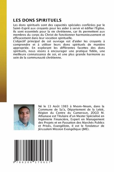 Les dons spirituels sont des capacités spéciales conférées par le Saint-Esprit aux croyants pour les aider à servir et édifier l'Église. Ils sont essentiels pour la vie chrétienne, car ils permettent aux membres du corps du Christ de fonctionner harmonieusement et efficacement dans leur vocation spirituelle. L'objectif principal de cet ouvrage est d'aider les croyants à comprendre et à utiliser leurs dons spirituels de manière appropriée. En explorant les différentes facettes des dons spirituels, nous visons à encourager une pratique fidèle, une meilleure connaissance de soi, et une plus grande harmonie au sein de la communauté chrétienne.