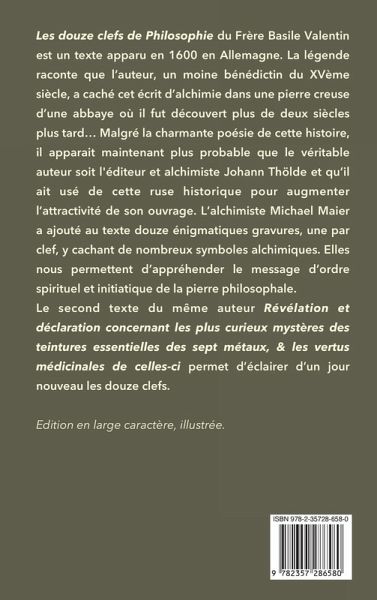 Les douze clefs de Philosophie de Frère Basile Valentin est un texte apparu en 1600 en Allemagne. La légende raconte que l'auteur, un moine bénédictin du XVème siècle, a caché cet écrit d'alchimie dans une pierre creuse d'une abbaye où il fut découvert plus de deux siècles plus tard... Malgré la charmante poésie de cette histoire, il apparait maintenant plus probable que le véritable auteur soit l'éditeur et alchimiste Johann Thölde et qu'il ait usé de cette ruse historique pour augmenter l'attractivité de son ouvrage. L'alchimiste Michael Maier a ajouté au texte douze énigmatiques gravures, une par clef, y cachant de nombreux symboles alchimiques. Elles nous permettent d'appréhender le message d'ordre spirituel et initiatique de la pierre philosophale. Le second texte du même auteur Révélation et déclaration concernant les plus curieux mystères des teintures essentielles des sept métaux, & les vertus médicinales de celles-ci permet d'éclairer d'un jour nouveau les douze clefs. Edition en large caractère, illustrée.