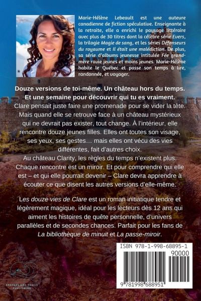 Douze versions de toi-même. Un château hors du temps. Et une semaine pour découvrir qui tu es vraiment. Clare pensait juste faire une promenade pour se vider la tête. Mais quand elle se retrouve face à un château mystérieux qui ne devrait pas exister, tout change. À l'intérieur, elle rencontre douze jeunes filles. Elles ont toutes son visage, ses yeux, ses gestes... mais elles ont vécu des vies différentes, fait d'autres choix. Au château Clarity, les règles du temps n'existent plus. Chaque rencontre est un miroir. Et pour comprendre qui elle est - et qui elle pourrait devenir - Clare devra apprendre à écouter ce que disent les autres versions d'elle-même. Les douze vies de Clare est un roman initiatique tendre et légèrement magique, idéal pour les lecteurs dès 12 ans qui aiment les histoires de quête personnelle, d'univers parallèles et de secondes chances. Parfait pour les fans de La bibliothèque de minuit et La passe-miroir.