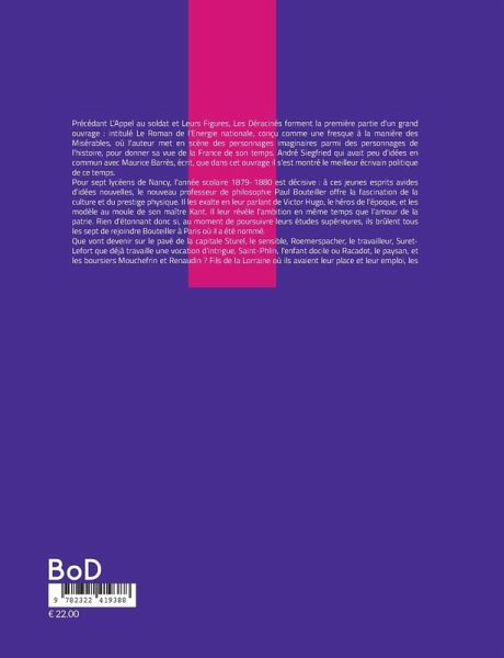 Précédant L'Appel au soldat et Leurs Figures, Les Déracinés forment la première partie d'un grand ouvrage : intitulé Le Roman de l'Energie nationale, conçu comme une fresque à la manière des Misérables, où l'auteur met en scène des personnages imaginaires parmi des personnages de l'histoire, pour donner sa vue de la France de son temps. André Siegfried qui avait peu d'idées en commun avec Maurice Barrès, écrit, que dans cet ouvrage il s'est montré le meilleur écrivain politique de ce temps.Pour sept lycéens de Nancy, l'année scolaire 1879-1880 est décisive : à ces jeunes esprits avides d'idées nouvelles, le nouveau professeur de philosophie Paul Bouteiller offre la fascination de la culture et du prestige physique. Il les exalte en leur parlant de Victor Hugo, le héros de l'époque, et les modèle au moule de son maître Kant. Il leur révèle l'ambition en même temps que l'amour de la patrie. Rien d'étonnant donc si, au moment de poursuivre leurs études supérieures, ils brûlent tous les sept de rejoindre Bouteiller à Paris où il a été nommé.Que vont devenir sur le pavé de la capitale Sturel, le sensible, Roemerspacher, le travailleur, Suret-Lefort que déjà travaille une vocation d'intrigue, Saint-Phlin, l'enfant docile ou Racadot, le paysan, et les boursiers Mouchefrin et Renaudin ? Fils de la Lorraine où ils avaient leur place et leur emploi, les voici déracinés. Maurice Barrès raconte leur essai d'adaptation, avec la passion de qui voit s'éloigner et se perdre les siens. Dans le destin tragique de Racadot et de Mouchefrin, dans les expériences inutiles ou décevantes des autres. S'exprime - par-delà les options politiques toujours discutables - le brûlant amour de la terre natale qui fait la grandeur de l'écrivain.