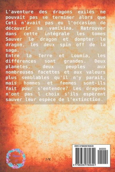 L'aventure des dragons exilés ne pouvait pas se terminer alors que Ceti n'avait pas eu l'occasion de découvrir sa vamikina. Retrouver dans cette intégrale les tomes Sauver le dragon et dompter le dragon, les deux spin off de la saga. Entre la Terre et Loumia, les différences sont grandes. Deux planètes, deux peuples aux nombreuses facettes et aux valeurs plus semblables qu'il n'y parait, mais hommes et femmes sont-ils fait pour s'entendre? Les dragons n'ont pas l choix s'ils espèrent sauver leur espèce de l'extinction.