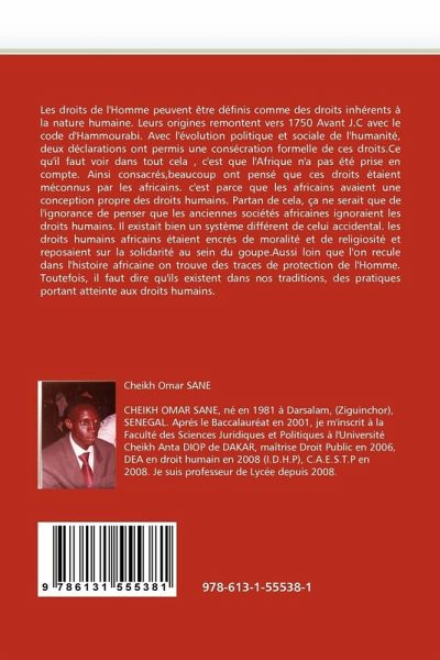 CHEIKH OMAR SANE, né en 1981 à Darsalam, (Ziguinchor), SENEGAL. Aprés le Baccalauréat en 2001, je m''inscrit à la Faculté des Sciences Juridiques et Politiques à l''Université Cheikh Anta DIOP de DAKAR, maîtrise Droit Public en 2006, DEA en droit humain en 2008 (I.D.H.P), C.A.E.S.T.P en 2008. Je suis professeur de Lycée depuis 2008.