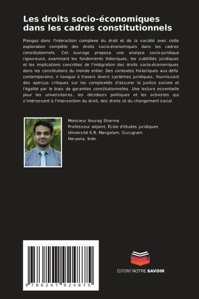 Plongez dans l'interaction complexe du droit et de la société avec cette exploration complète des droits socio-économiques dans les cadres constitutionnels. Cet ouvrage propose une analyse socio-juridique rigoureuse, examinant les fondements théoriques, les subtilités juridiques et les implications concrètes de l'intégration des droits socio-économiques dans les constitutions du monde entier. Des contextes historiques aux défis contemporains, il navigue à travers divers systèmes juridiques, fournissant des aperçus critiques sur les complexités d'assurer la justice sociale et l'égalité par le biais de garanties constitutionnelles. Une lecture essentielle pour les universitaires, les décideurs politiques et les activistes qui s'intéressent à l'intersection du droit, des droits et du changement social.
