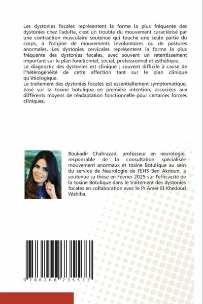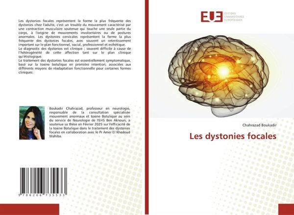 Les dystonies focales représentent la forme la plus fréquente des dystonies chez l'adulte, c'est un trouble du mouvement caractérisé par une contraction musculaire soutenue qui touche une seule partie du corps, à l'origine de mouvements involontaires ou de postures anormales. Les dystonies cervicales représentent la forme la plus fréquente des dystonies focales, avec souvent un retentissement important sur le plan fonctionnel, social, professionnel et esthétique.Le diagnostic des dystonies est clinique ; souvent difficile à cause de l'hétérogénéité de cette affection tant sur le plan clinique qu'étiologique.Le traitement des dystonies focales est essentiellement symptomatique, basé sur la toxine botulique en première intention, associées aux différents moyens de réadaptation fonctionnelle pour certaines formes cliniques.