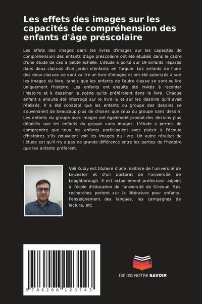 Les effets des images dans les livres d'images sur les capacités de compréhension des enfants d'âge préscolaire ont été étudiés dans le cadre d'une étude de cas à petite échelle. L'étude a porté sur 19 enfants répartis dans deux classes d'un jardin d'enfants en Turquie. Les enfants de l'une des deux classes se sont vu lire un livre d'images et ont été autorisés à voir les images du livre, tandis que les enfants de l'autre classe se sont vu lire uniquement l'histoire. Les enfants ont ensuite été invités à raconter l'histoire et à dessiner la scène qu'ils préféraient dans le livre. Chaque enfant a ensuite été interrogé sur le livre lu et sur les dessins qu'il avait réalisés. Il a été constaté que les enfants du groupe des dessins se souvenaient de beaucoup plus de choses que ceux du groupe sans dessin. Les enfants du groupe avec images ont également produit des dessins plus détaillés que les enfants du groupe sans images. L'étude a permis de comprendre que tous les enfants participaient avec plaisir à l'écoute d'histoires s'ils pouvaient voir les images du livre. Un autre résultat de l'étude est qu'il n'y a pas de grande différence entre les parties de l'histoire que les enfants préfèrent.