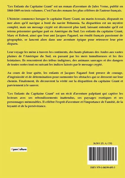 "Les Enfants du Capitaine Grant" est un roman d'aventure de Jules Verne, publié en 1868-1869 en trois volumes. C'est l'un des romans les plus célèbres de l'auteur français. L'histoire commence lorsque le capitaine Harry Grant, un marin écossais, disparaît en mer alors qu'il navigue à bord du navire Britannia. Sa disparition est un mystère complet, mais un message crypté est découvert plus tard, laissant entendre qu'il est retenu prisonnier quelque part en Amérique du Sud. Les enfants du capitaine Grant, Mary et Robert, ainsi que leur ami Jacques Paganel, un érudit français passionné de géographie, se lancent alors dans une aventure épique pour retrouver leur père disparu. Leur voyage les mène à travers les continents, des hauts plateaux des Andes aux vastes plaines de l'Amérique du Sud, en passant par les mers tumultueuses et les îles lointaines. Ils rencontrent des tribus indigènes, des animaux sauvages et des dangers de toutes sortes tout en suivant les indices laissés par le message crypté. Au cours de leur quête, les enfants et Jacques Paganel font preuve de courage, d'ingéniosité et de détermination pour surmonter les obstacles qui se dressent sur leur chemin. Finalement, ils découvrent la vérité sur la disparition du capitaine Grant et parviennent à le sauver. "Les Enfants du Capitaine Grant" est un récit d'aventure palpitant qui captive les lecteurs avec ses rebondissements inattendus, ses paysages exotiques et ses personnages mémorables. Il célèbre l'esprit d'aventure et l'importance de l'amitié, de la loyauté et de la persévérance.