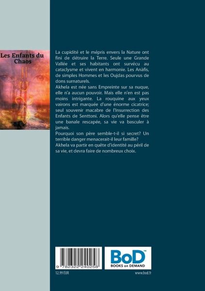 La cupidité et le mépris envers la Nature ont fini de détruire la Terre. Seule une Grande Vallée et ses habitants ont survécu au cataclysme et vivent en harmonie. Les Anàfis, de simples Hommes et les Oujdas pourvus de dons surnaturels.Akhela est née sans Empreinte sur sa nuque, elle n'a aucun pouvoir. Mais elle n'en est pas moins intrigante. La rouquine aux yeux vairons est marquée d'une énorme cicatrice; seul souvenir macabre de l'Insurrection des Enfants de Senttoni. Alors qu'elle pense être une banale rescapée, sa vie va basculer à jamais.Pourquoi son père semble-t-il si secret? Un terrible danger menacerait-il leur famille?Akhela va partir en quête d'identité au péril de sa vie, et devra faire de nombreux choix.
