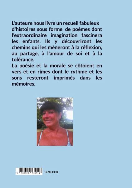 L'auteure nous livre un recueil fabuleux d'histoires sous forme de poèmes dont l'extraordinaire imagination fascinera les enfants. Ils y découvriront les chemins qui les mèneront à la réflexion, au partage, à l'amour de soi et à la tolérance. La poésie et la morale s'y côtoient en vers et en rimes dont le rythme et les sons resteront imprimés dans les mémoires.