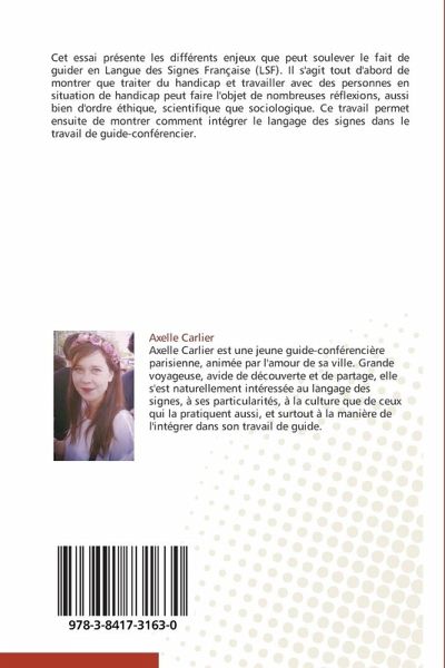 Cet essai présente les différents enjeux que peut soulever le fait de guider en Langue des Signes Française (LSF). Il s'agit tout d'abord de montrer que traiter du handicap et travailler avec des personnes en situation de handicap peut faire l'objet de nombreuses réflexions, aussi bien d'ordre éthique, scientifique que sociologique. Ce travail permet ensuite de montrer comment intégrer le langage des signes dans le travail de guide-conférencier.