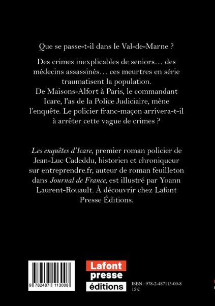 Que se passe-t-il dans le Val-de-Marne ? Des crimes inexplicables de seniors¿ des médecins assassinés¿ ces meurtres en série traumatisent la population. De Maisons-Alfort à Paris, le commandant Icare, l'as de la Police Judiciaire, mène l¿enquête. Le policier franc-maçon arrivera-t-il à arrêter cette vague de crimes ? Les enquêtes d¿Icare, premier roman policier de Jean-Luc Cadeddu, historien et chroniqueur sur entreprendre.fr, auteur de roman feuilleton dans Journal de France, est illustré par Yoann Laurent-Rouault. À découvrir chez Lafont Presse Éditions.