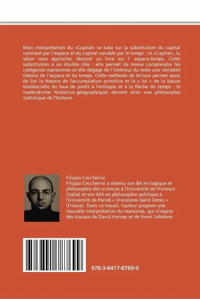 Mon interprétation du «Capital» se base sur la substitution du capital constant par l'espace et du capital variable par le temps : le «Capital», lu selon mon approche, devient un livre sur l' espace-temps. Cette substitution a un double rôle : elle permet de mieux comprendre les catégories marxiennes et elle dégage de l'intérieur du texte une véritable théorie de l'espace et du temps. Cette méthode de lecture permet aussi de lier la théorie de l'accumulation primitive et la « loi » de la baisse tendancielle du taux de profit à l'entropie et à la flèche du temps : le matérialisme historico(-géographique) devient ainsi une philosophie statistique de l'histoire.