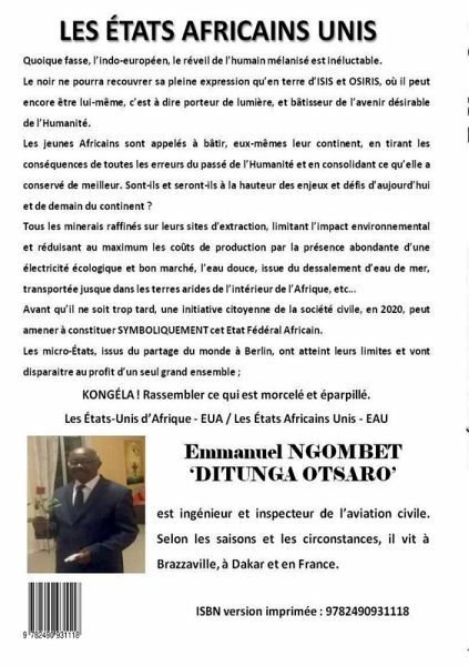 Les jeunes Africains sont appelés à bâtir, eux-mêmes leur continent, en tirant les conséquences de toutes les erreurs du passé de l'Humanité et en consolidant ce qu'elle a conservé de meilleur. Sont-ils et seront-ils à la hauteur des enjeux et défis d'aujourd'hui et de demain du continent ? Tous les minerais raffinés sur leurs sites d'extraction, limitant l'impact environnemental et réduisant au maximum les coûts de production par la présence abondante d'une électricité écologique et bon marché, l'eau douce, issue du dessalement d'eau de mer, transportée jusque dans les terres arides de l'intérieur de l'Afrique, etc... Avant qu'il ne soit trop tard, une initiative citoyenne de la société civile et des citoyens, en 2020, peut amener à constituer SYMBOLIQUEMENT cet embryon de l'Etat Fédéral Africain. Les micro-états issus du partage du monde à Berlin ont atteint leurs limites et vont disparaître au profit d'un seul grand ensemble ; KONGELA ! Rassembler ce qui est morcelé et éparpillé. Les Etats-Unis d'Afrique - EUA / Les Etats Africains Unis - EAU