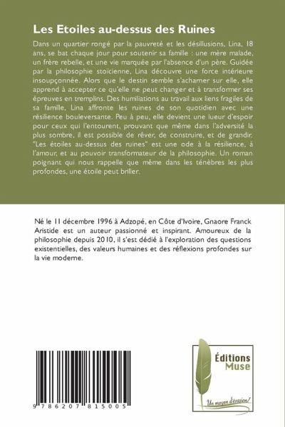 Dans un quartier rongé par la pauvreté et les désillusions, Lina, 18 ans, se bat chaque jour pour soutenir sa famille : une mère malade, un frère rebelle, et une vie marquée par l'absence d'un père. Guidée par la philosophie stoïcienne, Lina découvre une force intérieure insoupçonnée. Alors que le destin semble s'acharner sur elle, elle apprend à accepter ce qu'elle ne peut changer et à transformer ses épreuves en tremplins. Des humiliations au travail aux liens fragiles de sa famille, Lina affronte les ruines de son quotidien avec une résilience bouleversante. Peu à peu, elle devient une lueur d'espoir pour ceux qui l'entourent, prouvant que même dans l'adversité la plus sombre, il est possible de rêver, de construire, et de grandir. "Les étoiles au-dessus des ruines" est une ode à la résilience, à l'amour, et au pouvoir transformateur de la philosophie. Un roman poignant qui nous rappelle que même dans les ténèbres les plus profondes, une étoile peut briller.