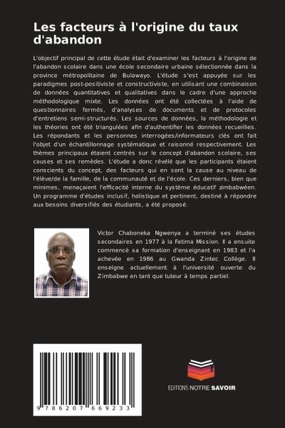 L'objectif principal de cette étude était d'examiner les facteurs à l'origine de l'abandon scolaire dans une école secondaire urbaine sélectionnée dans la province métropolitaine de Bulawayo. L'étude s'est appuyée sur les paradigmes post-positiviste et constructiviste, en utilisant une combinaison de données quantitatives et qualitatives dans le cadre d'une approche méthodologique mixte. Les données ont été collectées à l'aide de questionnaires fermés, d'analyses de documents et de protocoles d'entretiens semi-structurés. Les sources de données, la méthodologie et les théories ont été triangulées afin d'authentifier les données recueillies. Les répondants et les personnes interrogées/informateurs clés ont fait l'objet d'un échantillonnage systématique et raisonné respectivement. Les thèmes principaux étaient centrés sur le concept d'abandon scolaire, ses causes et ses remèdes. L'étude a donc révélé que les participants étaient conscients du concept, des facteurs qui en sont la cause au niveau de l'élève/de la famille, de la communauté et de l'école. Ces derniers, bien que minimes, menaçaient l'efficacité interne du système éducatif zimbabwéen. Un programme d'études inclusif, holistique et pertinent, destiné à répondre aux besoins diversifiés des étudiants, a été proposé.
