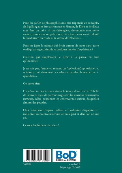 Peut-on parler de philosophie sans être tripoteur de concepts, de Big Bang sans être astronome et distrait, de Dieu et de dieux sans être un saint ni un théologien, d'économie sans s'être encore trompé sur ses prévisions, de science sans savoir calculé la quadrature du cercle ni la vitesse de l'électron ?Peut-on juger le monde qui bruit autour de nous sans autre outil qu'un regard simple et quelques années d'expérience ?N'a-t-on pas simplement le droit à la parole en tant qu'homme ?Je ne sais pas, j'essaie en tentant ces "aphorions", aphorismes et opinions, qui cherchent à évaluer ensemble l'essentiel et le quotidien...On verra bien !Du néant au néant, nous vivons le temps d'un flash à l'échelle de l'univers, mais de partout surgissent les illusions bruissantes, rumeurs, idées convenues et contrevérités autour desquelles dansent les peuples.Elles traversent l'espace sidéral en cohortes disparates et rutilantes, autocentrées, venues de nulle part et allant on ne sait où.Ce sont les fanfares du néant !