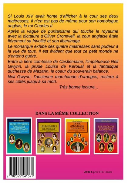 Traiter les galanteries des rois d'Angleterre par l'humour et l'anecdotique. Voici les grands traits de la petite histoire galante en bande dessinée. Ce treizième volume nous invite dans la vie amoureuse du roi Charles II d'Angleterre. Si Louis XIV avait honte d'afficher à la cour ses deux maitresses, Mademoiselle de La Vallière et Madame de Montespan, il n'en est pas de même pour son homologue anglais, Charles II. Après la vague de puritanisme qui touche le royaume avec la dictature d'Oliver Cromwell, la cour anglaise étale fièrement sa frivolité et son libertinage. Le monarque exhibe ses quatre maitresses sans pudeur à la vue de tous. Il est évident que tout ce petit monde ne s'entend guère. Entre la fière comtesse Castlemaine, l'impétueuse Nell Gwynn, la prude Louise de Keroual et la fantasque duchesse de Mazarin, le coeur du souverain balance. Nell Gwynn, l'ancienne marchande d'oranges, restera à ses côtés jusqu'à sa mort.