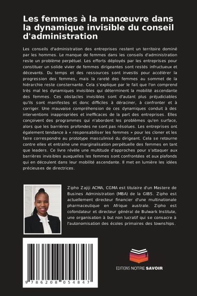 Les conseils d'administration des entreprises restent un territoire dominé par les hommes. Le manque de femmes dans les conseils d'administration reste un problème perpétuel. Les efforts déployés par les entreprises pour constituer un solide vivier de femmes dirigeantes sont restés infructueux et décevants. Du temps et des ressources sont investis pour accélérer la progression des femmes, mais la rareté des femmes au sommet de la hiérarchie reste consternante. Cela s'explique par le fait que l'on comprend très mal les dynamiques invisibles qui déterminent la mobilité ascendante des femmes. Ces obstacles invisibles sont d'autant plus préjudiciables qu'ils sont manifestes et donc difficiles à déraciner, à confronter et à corriger. Une mauvaise compréhension de ces dynamiques conduit à des interventions inappropriées et inefficaces de la part des entreprises. Elles conçoivent des programmes qui n'abordent les problèmes qu'en surface, alors que les barrières profondes ne sont pas résolues. Les entreprises ont également tendance à « responsabiliser les femmes » pour les cloner et les faire correspondre au prototype masculinisé du dirigeant. Cela se retourne contre elles et entraîne une marginalisation perpétuelle des femmes en tant que leaders. Ce livre révèle une multitude d'approches pour s'attaquer aux barrières invisibles auxquelles les femmes sont confrontées et aux plafonds qui en découlent dans leur mobilité ascendante. Il met en lumière les idées précieuses de directrices.
