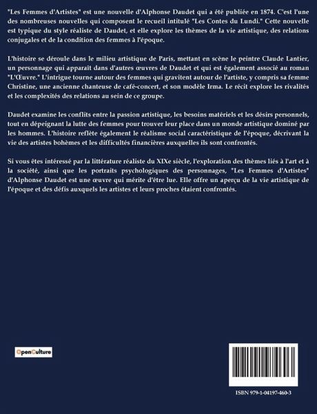 Les coulisses de la vie artistique parisienne du XIXe siècle se dévoilent à travers les récits d'Alphonse Daudet dans ' Les Femmes d'Artistes '. Ce livre nous transporte dans un univers où les passions créatives se mêlent aux intrigues personnelles, révélant les défis et les sacrifices des femmes qui partagent la vie des artistes. Dans un Paris en pleine effervescence culturelle, ces femmes, souvent reléguées à l'ombre de leurs compagnons célèbres, jouent un rôle charnière dans le développement et le quotidien de ces hommes de génie. À travers une série de portraits vivants et évolutifs, Daudet explore les relations complexes entre les artistes et leurs muses, mettant en lumière les attentes sociales et les conventions de l'époque. Chaque histoire est une fenêtre ouverte sur les aspirations, les désillusions et les espoirs de ces femmes, qui, bien que souvent invisibles, sont des piliers de la scène artistique. Le livre aborde des thèmes universels tels que l'amour, la jalousie, la fidélité et le changement, tout en offrant une réflexion sur la place des femmes dans un monde dominé par les hommes. En nous immergeant dans ces récits, Daudet nous offre une perspective innovante sur l'évolution des relations artistiques et personnelles. Ce livre nous permet de mieux comprendre les sacrifices et les compromis nécessaires pour vivre aux côtés de ceux qui façonnent l'art et la culture. À travers ces histoires, le lecteur est invité à réfléchir sur la nature de l'évolution et le rôle souvent méconnu des femmes dans l'ombre des grands artistes.