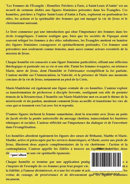 "Les Femmes de l'Évangile : Homélies Prêchées à Paris, à Saint-Louis d'Antin" est un recueil de sermons dédiés aux figures féminines présentes dans les Évangiles. Ces homélies, prêchées à l'église Saint-Louis d'Antin à Paris, explorent en profondeur les rôles, les actions et la spiritualité des femmes qui ont marqué la vie de Jésus et le christianisme naissant. Le livre commence par une introduction qui situe l'importance des femmes dans les récits évangéliques. L'auteur souligne que, bien que les sociétés de l'époque aient souvent relégué les femmes à des rôles subalternes, les Évangiles mettent en lumière des figures féminines courageuses et spirituellement profondes. Ces femmes sont présentées non seulement comme témoins, mais aussi comme acteurs essentiels de la mission de Jésus. Chaque homélie est consacrée à une figure féminine particulière, offrant une réflexion théologique et pastorale sur sa vie et son rôle. Parmi les femmes évoquées, on retrouve Marie, mère de Jésus, dont l'humilité et l'obéissance exemplifient la foi parfaite. L'auteur médite sur l'Annonciation, la Nativité, et la présence de Marie aux moments cruciaux de la vie de Jésus, notamment au pied de la Croix. Marie-Madeleine est également une figure centrale de ces homélies. L'auteur explore sa transformation de pécheresse à disciple fervente, soulignant son rôle de premier témoin de la Résurrection. L'homélie sur Marie-Madeleine met en avant le thème de la miséricorde et du pardon, montrant comment Jésus accueille et transforme les vies de ceux qui se tournent vers Lui avec foi et repentir. D'autres figures incluent la femme samaritaine, dont la rencontre avec Jésus au puits de Jacob révèle la portée universelle du message chrétien, transcendant les barrières ethniques et sociales. L'auteur réfléchit sur l'importance du dialogue et de l'ouverture dans l'évangélisation. Les homélies abordent également les figures des s¿urs de Béthanie, Marthe et Marie. Marthe, active et préoccupée par les services domestiques, et Marie, assise aux pieds de Jésus, illustrent deux aspects complémentaires de la vie chrétienne : l'action et la contemplation. L'auteur appelle les fidèles à trouver un équilibre entre ces deux dimensions pour une vie spirituelle épanouie. Chaque homélie se termine par une application pratique, invitant les fidèles à s'inspirer de l'exemple de ces femmes pour leur propre vie. Les sermons encouragent à la fidélité, à l'amour désintéressé, et à une foi vivante et active. Ils mettent en avant les vertus de courage, de persévérance et de dévouement que ces figures féminines incarnent.