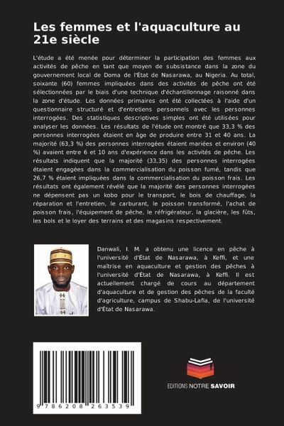 L'étude a été menée pour déterminer la participation des femmes aux activités de pêche en tant que moyen de subsistance dans la zone du gouvernement local de Doma de l'État de Nasarawa, au Nigeria. Au total, soixante (60) femmes impliquées dans des activités de pêche ont été sélectionnées par le biais d'une technique d'échantillonnage raisonné dans la zone d'étude. Les données primaires ont été collectées à l'aide d'un questionnaire structuré et d'entretiens personnels avec les personnes interrogées. Des statistiques descriptives simples ont été utilisées pour analyser les données. Les résultats de l'étude ont montré que 33,3 % des personnes interrogées étaient en âge de produire entre 31 et 40 ans. La majorité (63,3 %) des personnes interrogées étaient mariées et environ (40 %) avaient entre 6 et 10 ans d'expérience dans les activités de pêche. Les résultats indiquent que la majorité (33,35) des personnes interrogées étaient engagées dans la commercialisation du poisson fumé, tandis que 26,7 % étaient impliquées dans la commercialisation du poisson frais. Les résultats ont également révélé que la majorité des personnes interrogées ne dépensent pas un kobo pour le transport, le bois de chauffage, la réparation et l'entretien, le carburant, le poisson transformé, l'achat de poisson frais, l'équipement de pêche, le réfrigérateur, la glacière, les fûts, les bols et le loyer des terrains et des magasins respectivement.