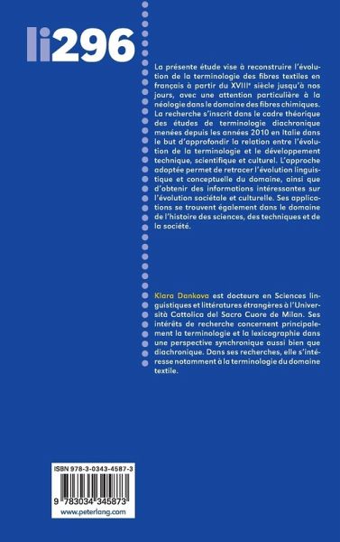 Table des matières - Liste des tableaux- Liste des figures- Liste des abréviations-Introduction- Le cadre théorique de référence : la terminologie diachronique- Les études sur les fibres textiles : le XVIIIe et le XIXe siècle- Les études sur les fibres textiles : le XXe et le XXIe siècle- L'organisation conceptuelle du domaine des fibres textiles et son evolution- Les dénominations des fibres chimiques. Analyse linguistico-terminologique- Conclusion- Index alphabétique des termes- Références bibliographiques
