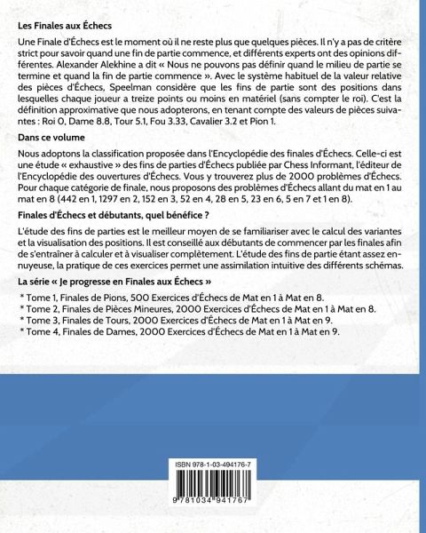 Dans ce volume, nous adoptons la classification proposée dans l'Encyclopédie des finales d'Échecs. Celle-ci est une étude exhaustive des fins de parties d'Échecs publiée par Chess Informant, l'éditeur de l'Encyclopédie des ouvertures d'Échecs. Toutes les catégories sont traitées : * Cavalier / Roi isolé, * Cavalier / Pion(s), * Fou / Roi isolé, * Fou / Pion(s), * Cavalier / Cavalier, * Fou et Pion(s) / Cavalier seul, * Fou seul / Cavalier et Pion(s), * Fou et Pion(s) / Cavalier et Pion(s) avec un nombre inégal de Pions, * Fou et Pion(s) / Cavalier et Pion(s) avec un même nombre de Pions, * Fou / Fou de couleur opposée, * Fou / Fou de couleur identique, * 2 Pièces Mineures / Roi isolé, * 2 Pièces Mineures / Pion(s), * 2 Pièces Mineures / 1 Pièce Mineure, * Autres Finales de Pièces Mineures. Vous trouverez donc 2000 problèmes d'Échecs de mat en 1 à mat en 8 (442 en 1, 1297 en 2, 152 en 3, 52 en 4, 28 en 5, 23 en 6, 5 en 7 et 1 en 8). Enfin, c'est un livre grand format 21,59 cm x 27,94 cm (8.5" x 11") pour un plus grand confort et une meilleure lisibilité. La série Je progresse en Finales aux Échecs se compose de 4 tomes : * Tome 1, Finales de Pions, 500 Exercices d'Échecs de Mat en 1 à Mat en 8. * Tome 2, Finales de Pièces Mineures, 2000 Exercices d'Échecs de Mat en 1 à Mat en 8. * Tome 3, Finales de Tours, 2000 Exercices d'Échecs de Mat en 1 à Mat en 9. * Tome 4, Finales de Dames, 2000 Exercices d'Échecs de Mat en 1 à Mat en 9. Finales d'Échecs et débutants, quel bénéfice ? L'étude des fins de parties est le meilleur moyen de se familiariser avec le calcul des variantes et la visualisation des positions. Il est conseillé aux débutants de commencer par les finales afin de s'entraîner à calculer et à visualiser complètement. L'étude des fins de partie étant assez ennuyeuse, la pratique de ces exercices permet une assimilation intuitive des différents schémas.