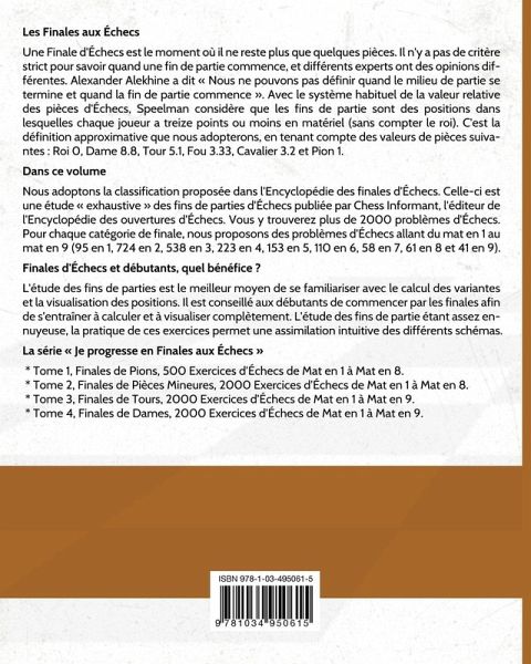 Dans ce volume, nous adoptons la classification proposée dans l'Encyclopédie des finales d'Échecs. Celle-ci est une étude exhaustive des fins de parties d'Échecs publiée par Chess Informant, l'éditeur de l'Encyclopédie des ouvertures d'Échecs. Toutes les catégories sont traitées : * Dame / Roi isolé, * Dame / Pion(s), * Dame / Cavalier, * Dame / Fou, * Dame / Tour, * Dame seule / Dame seule, * Dame avec Pion(s) / Dame seule, * Dame avec Pion(s) / Dame avec Pion(s), * Dame / 2 Pièces Mineures, * Dame / 1 Tour et 1 Pièce Mineure, * Dame / 2 Tours, * Dame / 3 Pièces Mineures, * Dame / 1 Tour et 2 Pièces Mineures, * Dame / 2 Tours et 1 Pièce Mineure, * Dame / 3 Tours, * Dame et 1 Pièce Mineure / Pion(s), * Dame et 1 Pièce Mineure / 1 Pièce Mineure, * Dame et 1 Pièce Mineure / 1 Tour, * Dame et 1 Pièce Mineure / Dame, * Dame et 1 Pièce Mineure / 2 Pièces Mineures, * Dame et 1 Pièce Mineure / 1 Tour et 1 Pièce Mineure, * Dame et 1 Pièce Mineure / 2 Tours, * Dame et 1 Pièce Mineure / Dame et 1 Pièce Mineure, * Autres Finales de Dames. Dans ce livre grand format, vous attendent 2000 problèmes de mat en 1 à 9 (95 en 1, 724 en 2, 538 en 3, 223 en 4, 153 en 5, 110 en 6, 58 en 7, 61 en 8 et 41 en 9). La série Je progresse en Finales aux Échecs se compose de 4 tomes : * T. 1, Finales de Pions, 500 Exercices d'Échecs de Mat en 1 à 8. * T. 2, Finales de Pièces Mineures, 2000 Exercices d'Échecs de Mat en 1 à 8. * T. 3, Finales de Tours, 2000 Exercices d'Échecs de Mat en 1 à 9. * T. 4, Finales de Dames, 2000 Exercices d'Échecs de Mat en 1 à 9. Finales d'Échecs et débutants, quel bénéfice ? L'étude des fins de parties permet de se familiariser avec le calcul des variantes et la visualisation des positions. Il est conseillé aux débutants de commencer par les finales afin de s'entraîner à calculer et à visualiser complètement. L'étude des fins de partie étant assez ennuyeuse, la pratique de ces exercices permet une assimilation intuitive des différents schémas.