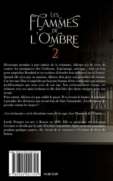 Désormais membre à part entière de la résistance, Aliénor n'a de cesse de contrer les manigances des Corbeaux. Espionnage, sabotage... tout est bon pour empêcher Rosalind et ses acolytes d'étendre leur influence sur la France.Quand elle n'est pas en mission, Aliénor doit gérer son quotidien de vivante. Car être une Élue n'empêche pas la jeune femme d'être confrontée aux mêmes problématiques que tous ceux de son âge. Son environnement change, ses relations avec ses amis évoluent et elle doit faire des choix cruciaux pour son avenir.Pour autant, Aliénor n'a pas oublié le passé. Il va revenir la hanter, la poussant à prendre des décisions qui seront loin de faire l'unanimité. A-t-elle raison de prendre autant de risques ?"La cérémonie" est le deuxième tome de la saga "Les Flammes de l'Ombre".