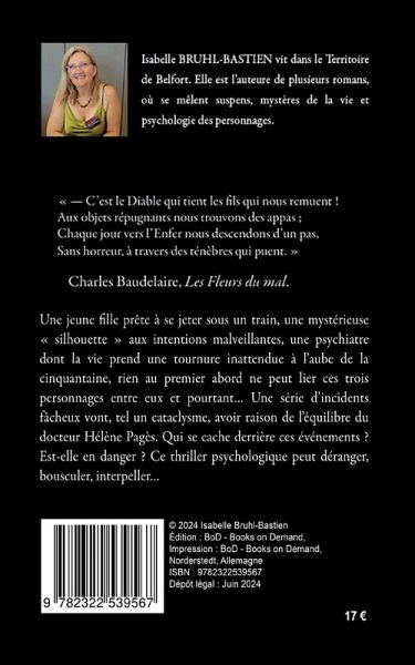 Une jeune fille prête à se jeter sous un train, une mystérieuse silhouette aux intentions malveillantes, une psychiatre dont la vie prend une tournure inattendue à l'aube de la cinquantaine, rien au premier abord ne peut lier ces trois personnage entre eux et pourtant... Une série d'incidents fâcheux vont, tel un cataclysme, avoir raison de l'équilibre du docteur Hélène Pagès. Qui se cache derrière ces événements ? Est-elle en danger ?Ce roman psychologique peut déranger, bousculer, interpeller.