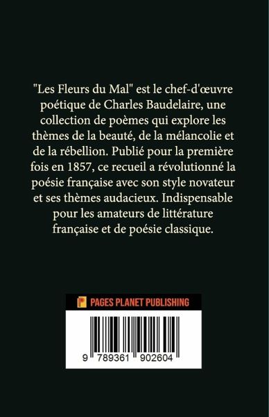 "Les Fleurs du Mal" est le chef-d'¿uvre poétique de Charles Baudelaire, une collection de poèmes qui explore les thèmes de la beauté, de la mélancolie et de la rébellion. Publié pour la première fois en 1857, ce recueil a révolutionné la poésie française avec son style novateur et ses thèmes audacieux. Indispensable pour les amateurs de littérature française et de poésie classique.