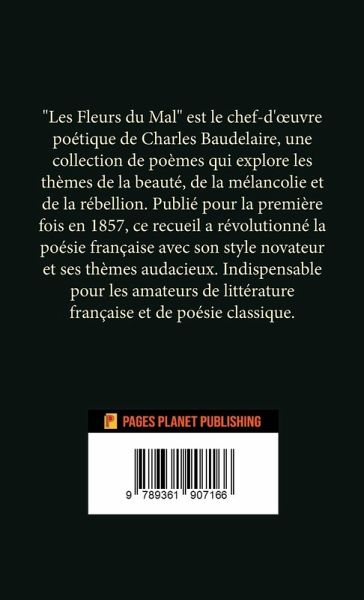 "Les Fleurs du Mal" est le chef-d'¿uvre poétique de Charles Baudelaire, une collection de poèmes qui explore les thèmes de la beauté, de la mélancolie et de la rébellion. Publié pour la première fois en 1857, ce recueil a révolutionné la poésie française avec son style novateur et ses thèmes audacieux. Indispensable pour les amateurs de littérature française et de poésie classique.