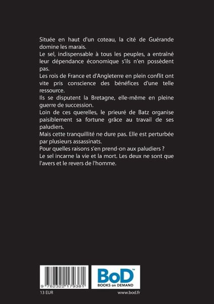 Située en haut d'un coteau, la cité de Guérande domine les marais.Le sel, indispensable à tous les peuples, a entraîné leur dépendance économique s'ils n'en possèdent pas.Les rois de France et d'Angleterre en plein conflit ont vite pris conscience des bénéfices d'une telle ressource.Ils se disputent la Bretagne, elle-même en pleine guerre de succession.Loin de ces querelles, le prieuré de Batz organise paisiblement sa fortune grâce au travail de ses paludiers.Mais cette tranquillité ne dure pas. Elle est perturbée par plusieurs assassinats.Pour quelles raisons s'en prend-on aux paludiers ?Le sel incarne la vie et la mort. Les deux ne sont que l'avers et le revers de l'homme.