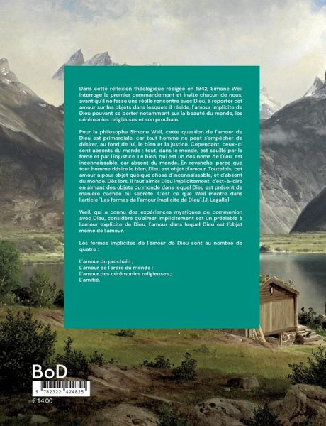 Dans cette réflexion théologique rédigée en 1942, Simone Weil interroge le premier commandement et invite chacun de nous, avant qu'il ne fasse une réelle rencontre avec Dieu, à reporter cet amour sur les objets dans lesquels il réside, l'amour implicite de Dieu pouvant se porter notamment sur la beauté du monde, les cérémonies religieuses et son prochain.Pour la philosophe Simone Weil, cette question de l'amour de Dieu est primordiale, car tout homme ne peut s'empêcher de désirer, au fond de lui, le bien et la justice. Cependant, ceux-ci sont absents du monde : tout, dans le monde, est souillé par la force et par l'injustice. Le bien, qui est un des noms de Dieu, est inconnaissable, car absent du monde. En revanche, parce que tout homme désire le bien, Dieu est objet d'amour. Toutefois, cet amour a pour objet quelque chose d'inconnaissable, et d'absent du monde. Dès lors, il faut aimer Dieu implicitement, c'est-à-dire en aimant des objets du monde dans lequel Dieu est présent de manière cachée ou secrète. C'est ce que Weil montre dans l'article "Les formes de l'amour implicite de Dieu".[J. Lagalle]Weil, qui a connu des expériences mystiques de communion avec Dieu, considère qu'aimer implicitement est un préalable à l'amour explicite de Dieu, l'amour dans lequel Dieu est l'objet même de l'amour.Les formes implicites de l'amour de Dieu sont au nombre de quatre :L'amour du prochain ;L'amour de l'ordre du monde ;L'amour des cérémonies religieuses ;L'amitié.