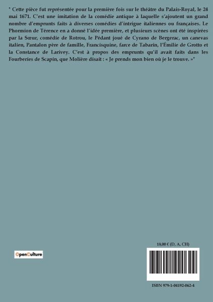 " Cette pièce fut représentée pour la première fois sur le théâtre du Palais-Royal, le 24 mai 1671. C¿est une imitation de la comédie antique à laquelle s¿ajoutent un grand nombre d¿emprunts faits à diverses comédies d¿intrigue italiennes ou françaises. Le Phormion de Térence en a donné l¿idée première, et plusieurs scènes ont été inspirées par la S¿ur, comédie de Rotrou, le Pédant joué de Cyrano de Bergerac, un canevas italien, Pantalon père de famille, Francisquine, farce de Tabarin, l¿Émilie de Grotto et la Constance de Larivey. C¿est à propos des emprunts qüil avait faits dans les Fourberies de Scapin, que Molière disait : « Je prends mon bien où je le trouve. »"