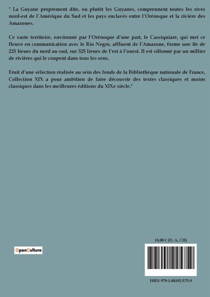 " La Guyane proprement dite, ou plutôt les Guyanes, comprennent toutes les rives nord-est de l¿Amérique du Sud et les pays enclavés entre l¿Orénoque et la rivière des Amazones. Ce vaste territoire, environné par l¿Orénoque d¿une part, le Cassiquiare, qui met ce fleuve en communication avec le Rio Negro, affluent de l¿Amazone, forme une île de 225 lieues du nord au sud, sur 325 lieues de l¿est à l¿ouest. Il est sillonné par un millier de rivières qui le coupent dans tous les sens. Fruit d¿une sélection réalisée au sein des fonds de la Bibliothèque nationale de France, Collection XIX a pour ambition de faire découvrir des textes classiques et moins classiques dans les meilleures éditions du XIXe siècle."