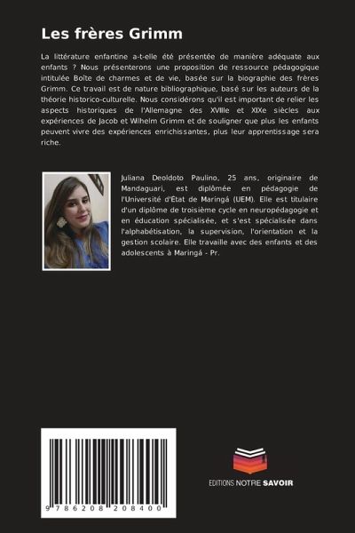 La littérature enfantine a-t-elle été présentée de manière adéquate aux enfants ? Nous présenterons une proposition de ressource pédagogique intitulée Boîte de charmes et de vie, basée sur la biographie des frères Grimm. Ce travail est de nature bibliographique, basé sur les auteurs de la théorie historico-culturelle. Nous considérons qu'il est important de relier les aspects historiques de l'Allemagne des XVIIIe et XIXe siècles aux expériences de Jacob et Wilhelm Grimm et de souligner que plus les enfants peuvent vivre des expériences enrichissantes, plus leur apprentissage sera riche.